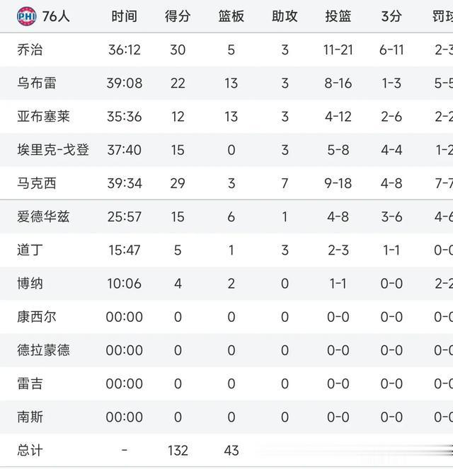 76人方面,乔治拿到全队最高的30分,球队一共有六人得分上双,具体数据如下。