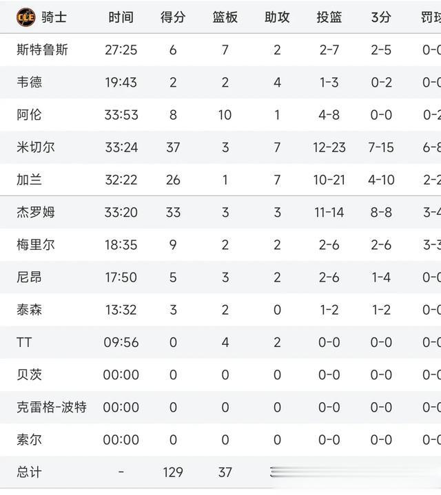 骑士方面,米切尔拿到全队最高的37分,球队一共有三人得分上双,并且都是超过20分,具体数据如下。